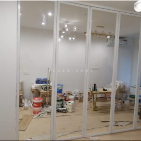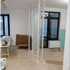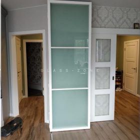 - Стеклянные перегородки. Этот вид перегородок идеально подходит для создания открытой и светлой атмосферы в комнате. Стеклянные перегородки могут быть использованы как в качестве полностью прозрачных элементов, так и с различными дизайнерскими решениями на них, такими как фрезеровка или нанесение рисунка или логотипа.